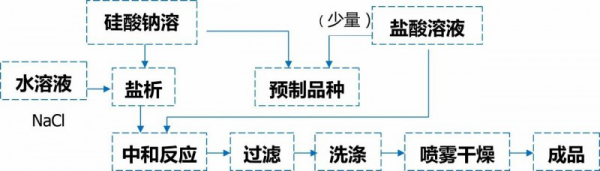 傳統(tǒng)沉淀法生產(chǎn)白炭黑方法的工藝較多,其基本原理幾乎相同,即將一定濃度硅酸鈉溶液與酸進(jìn)行反應(yīng),生成硅酸微粒,再進(jìn)行脫水、干燥、粉碎、篩分則得到成品。